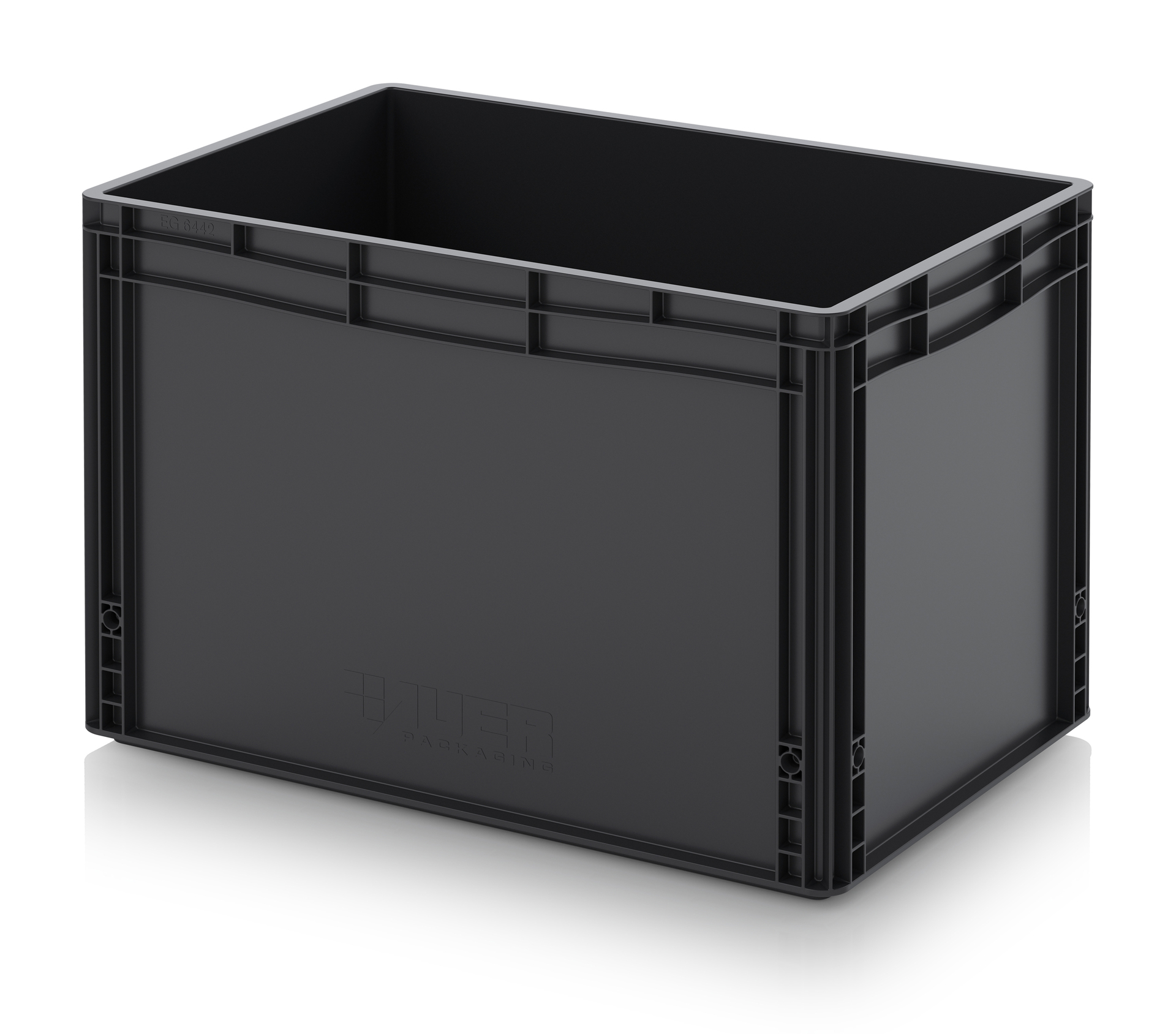 Евроконтейнер с ESD-защитой производства компании AUER Packaging изготавливается из антистатической пластмассы, что делает его пригодным, в частности, для надежного хранения и транспортировки электронной продукции.