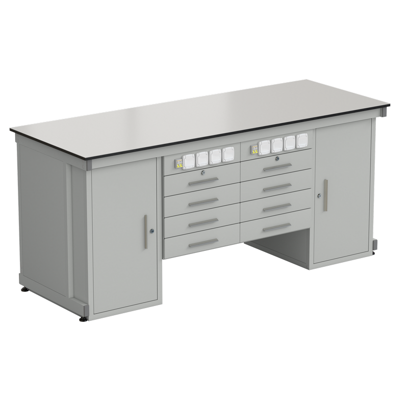 Предназначен для проведения демонстрационных опытов преподавателем, в кабинетах химии и физики. В комплекте имеет 2 напольные тумбы, 2 подвесные тумбы с четырьмя выдвижными ящиками, сервисную панель, установленную под рабочей поверхность с 8 розетками и 2 УЗО. Устанавливается на регулируемые опоры для компенсации неровностей пола и для выравнивания мебели в одной плоскости. В правой сервисной тумбе размещены автоматические выключатели для управления электропитанием аудитории (класса) и розетки постоянного тока.