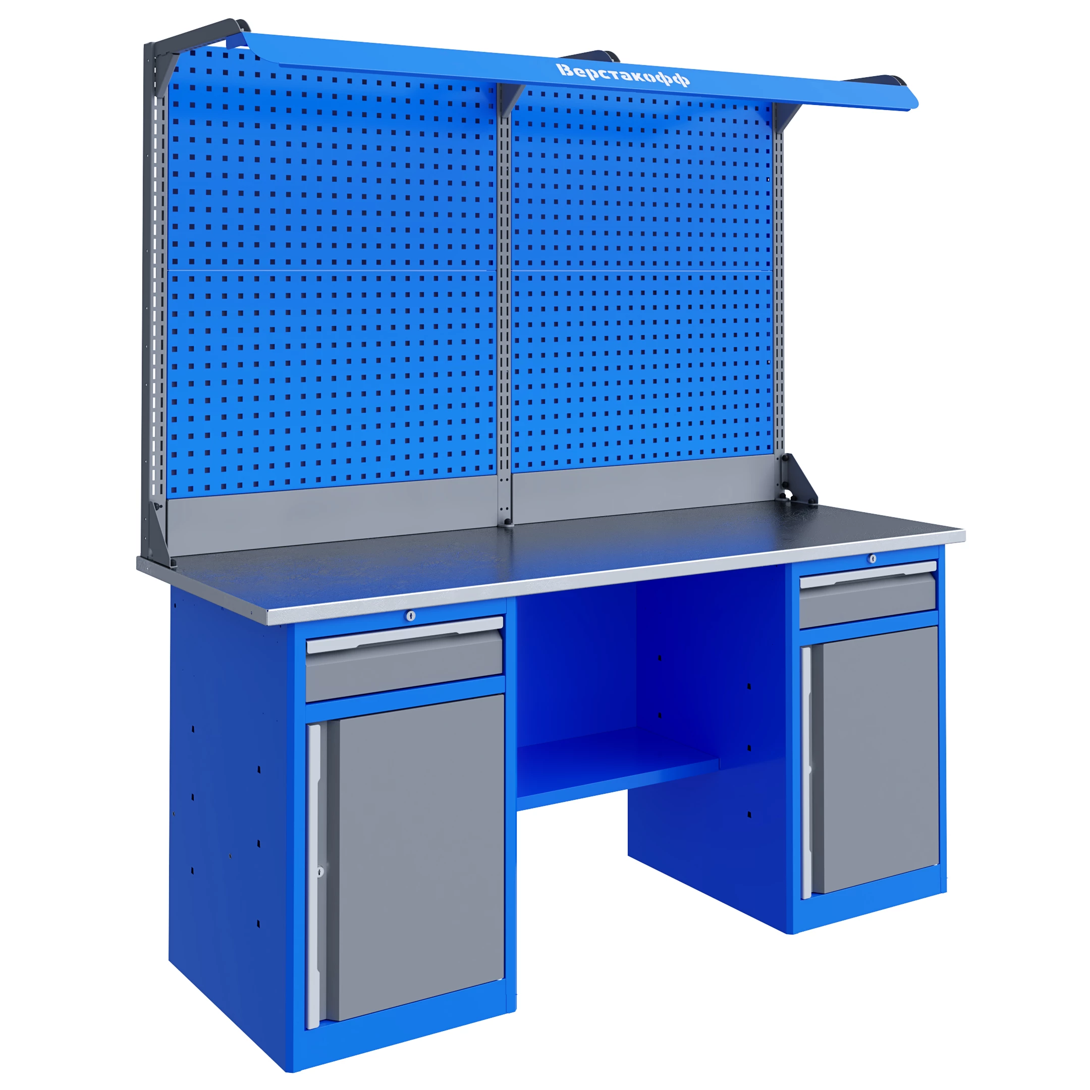 Верстак серии Technic 181.68.2-2F состоит из столешницы шириной 1796 мм, двух тумб P8 с малым ящиком и отделением с дверью, полки-стенки, двойного экрана с кронштейнами и комплекта освещения.