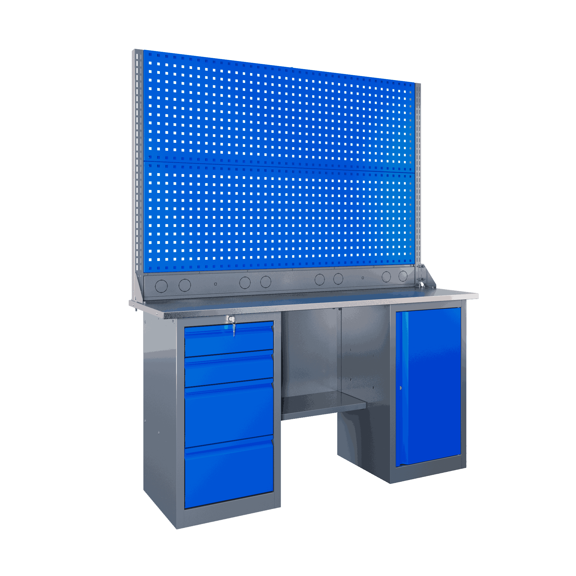 Столешница — это гордость модели. Основа из 24-мм фанеры покрыта оцинкованной сталью толщиной 1,2 мм, что наделяет рабочую поверхность устойчивостью к коррозии, царапинам и агрессивным веществам. Продуманная перфорация 12х12 мм с шагом 38 мм открывает безграничные возможности для фиксации деталей и оснастки. Функциональная полка-стенка позволяет содержать инструменты в идеальном порядке и всегда на виду.