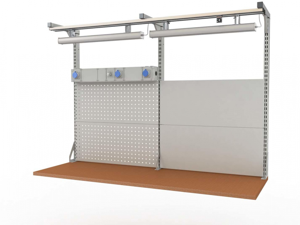 Организуйте идеальное рабочее место в мастерской с рабочей панелью 1320х2000.2 от бренда ДВК. Это готовое модульное решение для профессионалов, которое экономит время на оснащение и повышает эффективность труда. Панель размером 1320x2000 мм уже включает всё необходимое: перфорированные и сплошные навесные стенки, несущие стойки, шину для электропроводки, три розетки IP54, светодиодные светильники и пневматические разъёмы. Вы получаете полноценную систему хранения и доступа к инструменту без доработок.