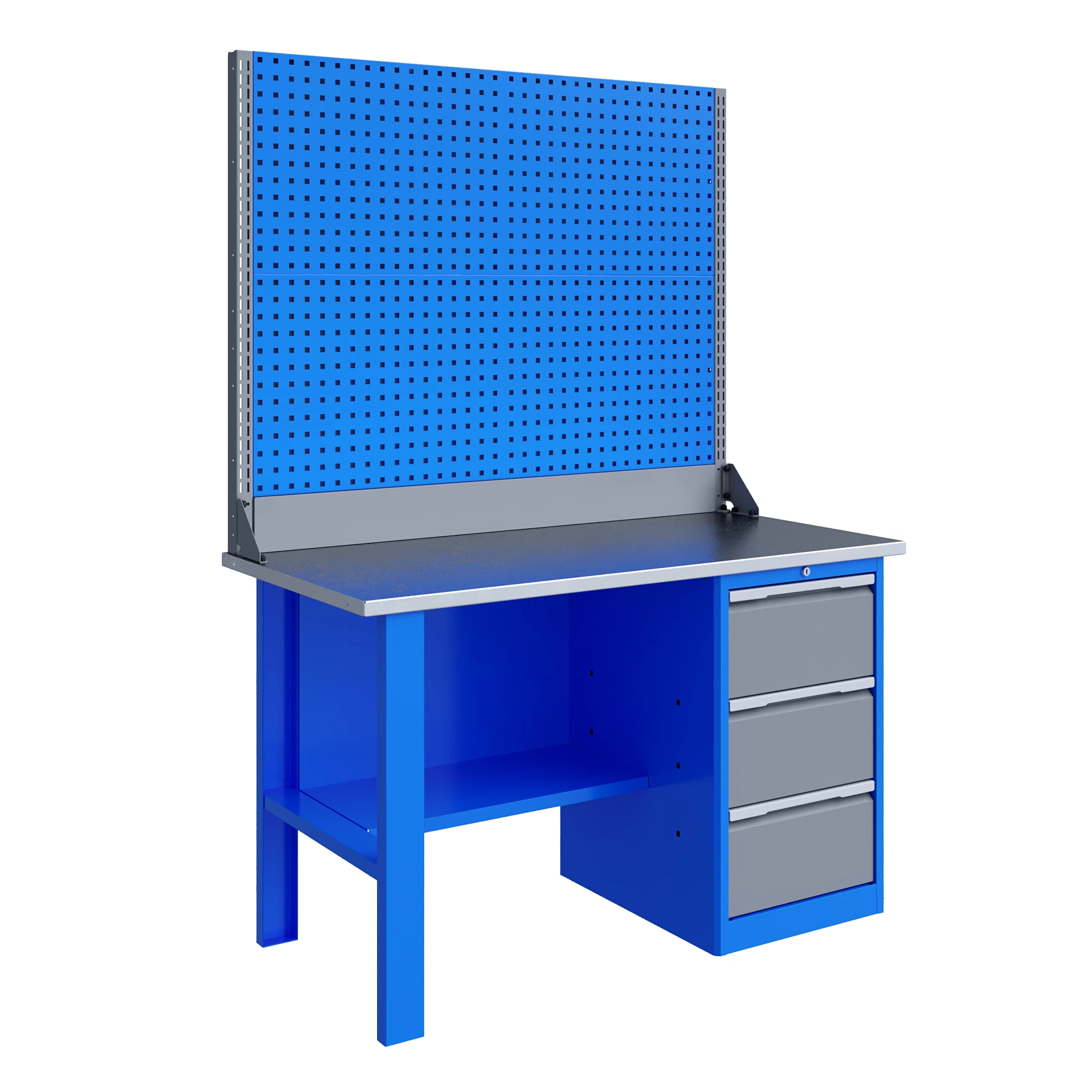 Верстак серии Technic 141.13.2-2 состоит из столешницы шириной 1396 мм, опоры, тумбы P3 с тремя большими ящикам, полки-стенки, двойного экрана с кронштейнами