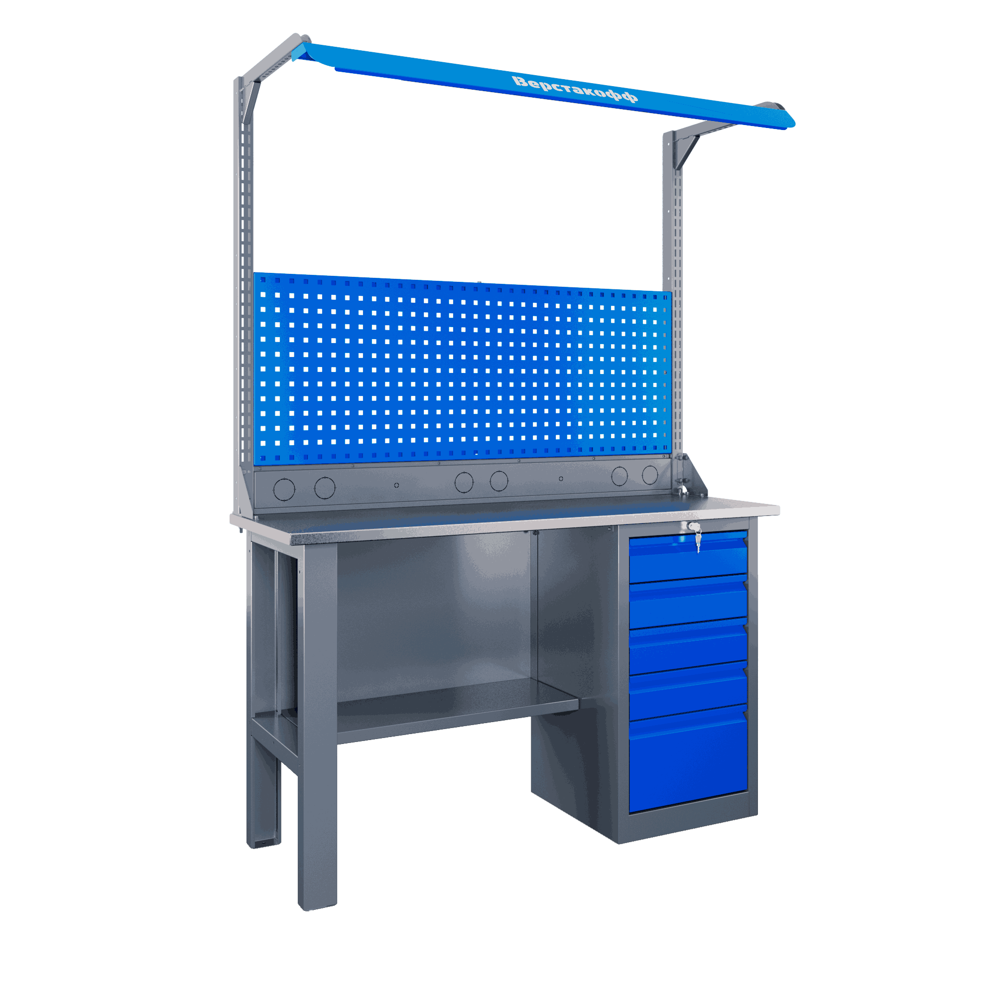 Верстак SLF 141.15.2-1FR – профессиональное рабочее место для тех, кто ценит надёжность и функциональность. Этот усиленный однотумбовый верстак от российского бренда «Верстакофф» выдерживает распределённую нагрузку до 500 кг и оснащён столешницей из фанеры 24 мм с оцинкованным стальным покрытием 1,2 мм. Перфорация 12х12 мм с шагом 38 мм позволяет гибко крепить полки, кронштейны и держатели, а встроенная светодиодная подсветка делает работу комфортной даже при недостаточном освещении.