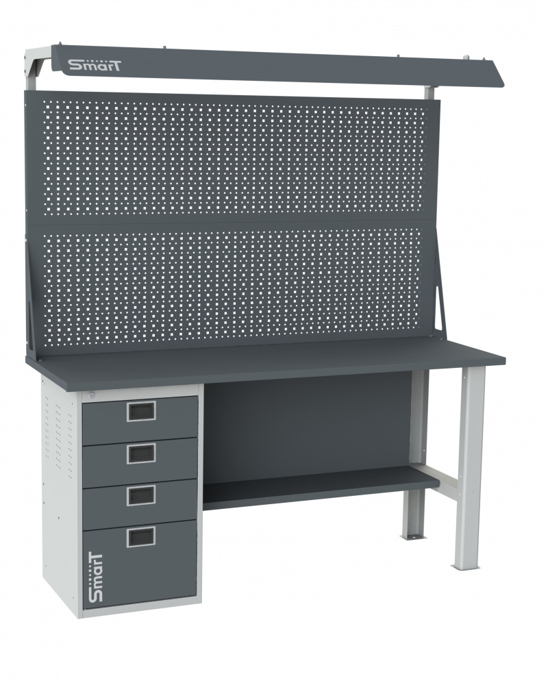 Универсальный металлический верстак серии Smart предназначен для обустройства легких производств, мастерских и гаражей. Все элементы изготовлены из высококачественной листовой стали, а покрытие устойчиво к механическим воздействиям и агрессивным жидкостям.