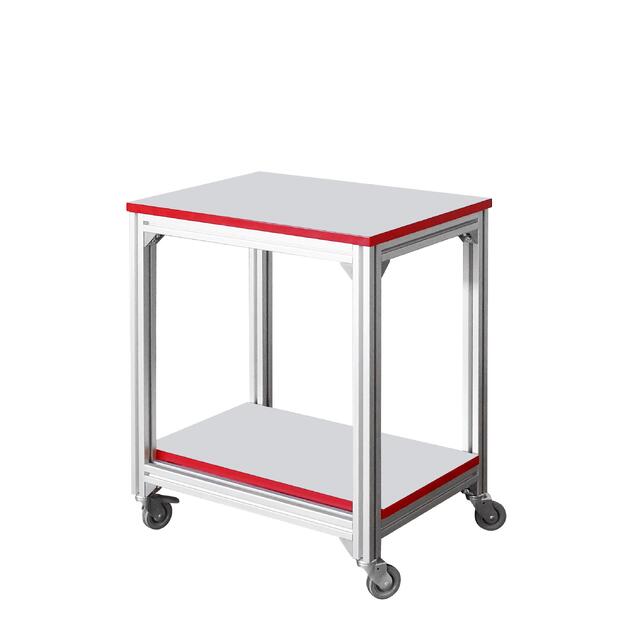 Стол оснащен четырьмя колесными опорами, две из которых с механизмом фиксации. Столешница толщиной 25 мм. изготовлена из ламинированной ДСП. Износостойкое покрытие из промышленного пластика обладает высокой стойкостью к термическим и механическим нагрузкам. Цвет боковой кромки стола — бордовый.
