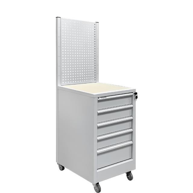Стойка оснащена центральным замком для индивидуального доступа. Каркас и ящики изготовлены из листового металла для увеличения эксплуатационного ресурса и повышения надежности. Ящики защищают рабочие материалы, инструменты от загрязнения и сохраняют их в исходном состоянии. Ручки изготовлены из алюминиевого профиля с анодированным покрытием и боковыми пазами для установки обозначения (маркировки) ящиков по их прямому назначению (подразделение организации, документация, инструменты, материалы и т.д.).