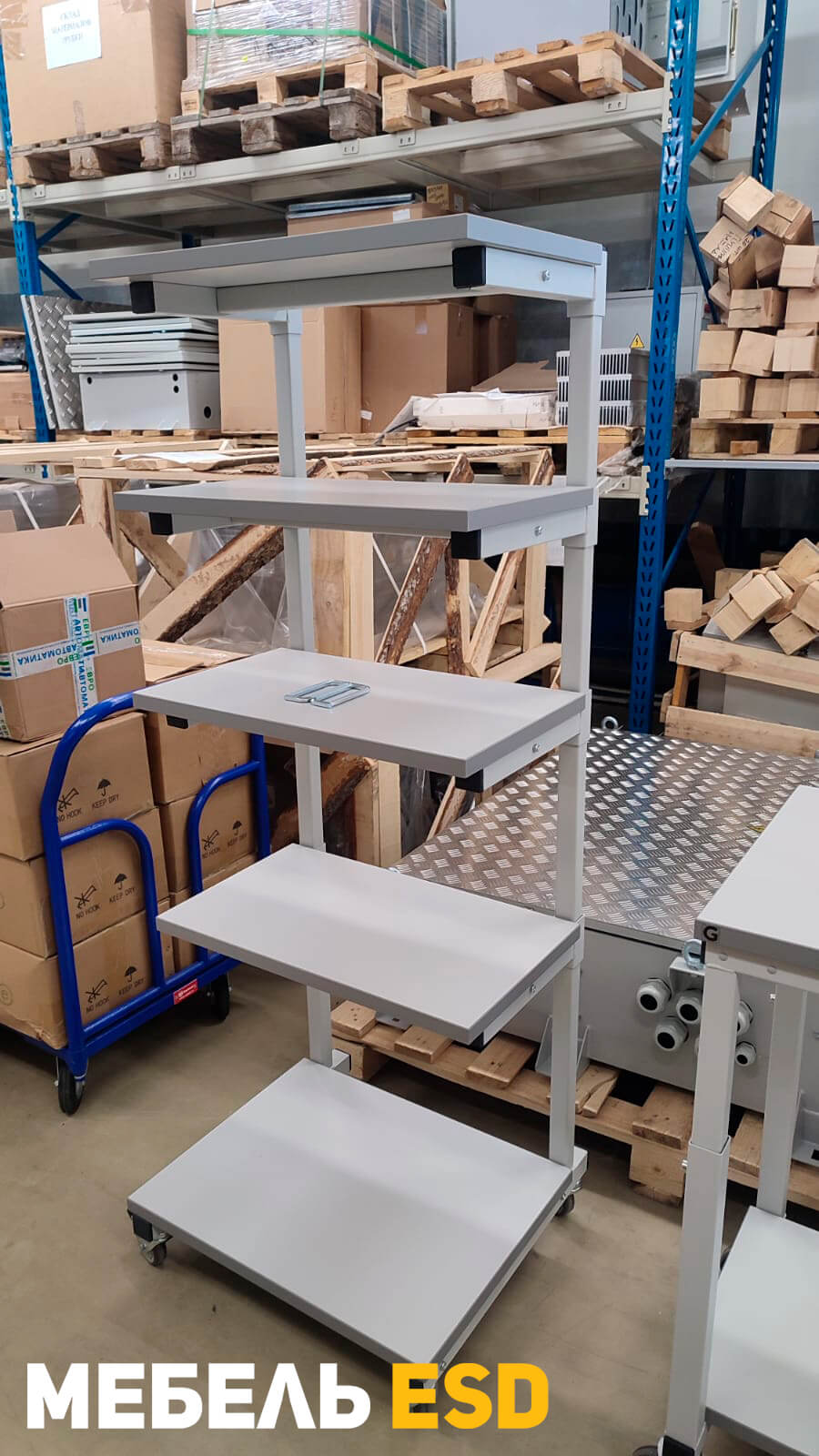 Стойка антистатическая согласно требованиям стандарта ГОСТ IEC 61340-5-1-2019, на лицевой стороне имеет маркировку esd иконка - знак ESD (Electrostatic sensitive device), обозначающий работу с материалами чувствительными к электростатическому разряду. В комплект поставки антистатической стойки входит набор ESD колес. В комплект поставки антистатической стойки входит ESD набор для заземления полок — болт и провод с клеммой.